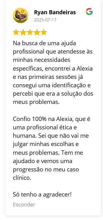 Ryan Bandeiras2025-07-17Na busca de uma ajuda profissional que atendesse às minhas necessidades específicas, encontrei a Alexia e nas primeiras sessões já consegui uma identificação e percebi que era a solução dos meus problemas. Confio 100% na Alexia, que é uma profissional ética e humana. Sei que não vai me julgar minhas escolhas e meus problemas. Tem me ajudado e vemos uma progressão no meu caso clínico. Só tenho a agradecer!