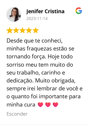 Jenifer Cristina2023-11-14Desde que te conheci, minhas fraquezas estão se tornando força. Hoje todo sorriso meu tem muito do seu trabalho, carinho e dedicação. Muito obrigada, sempre irei lembrar de você e o quanto foi importante para minha cura ❤️❤️❤️