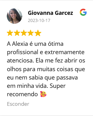 Giovanna Garcez2023-10-17A Alexia é uma ótima profissional e extremamente atenciosa. Ela me fez abrir os olhos para muitas coisas que eu nem sabia que passava em minha vida. Super recomendo 🥰